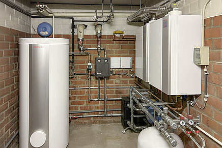 Eine der beiden Kaskaden mit zwei Gas-Brennwertgeräten Weishaupt Thermo Condens® WTC-GW 32 und einem 400-Liter-Trinkwasserspeicher.