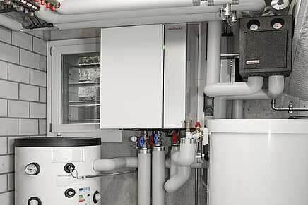Im Keller befinden sich das Innengerät der Wärmepumpe sowie der Trinkwasser- und Pufferspeicher.
