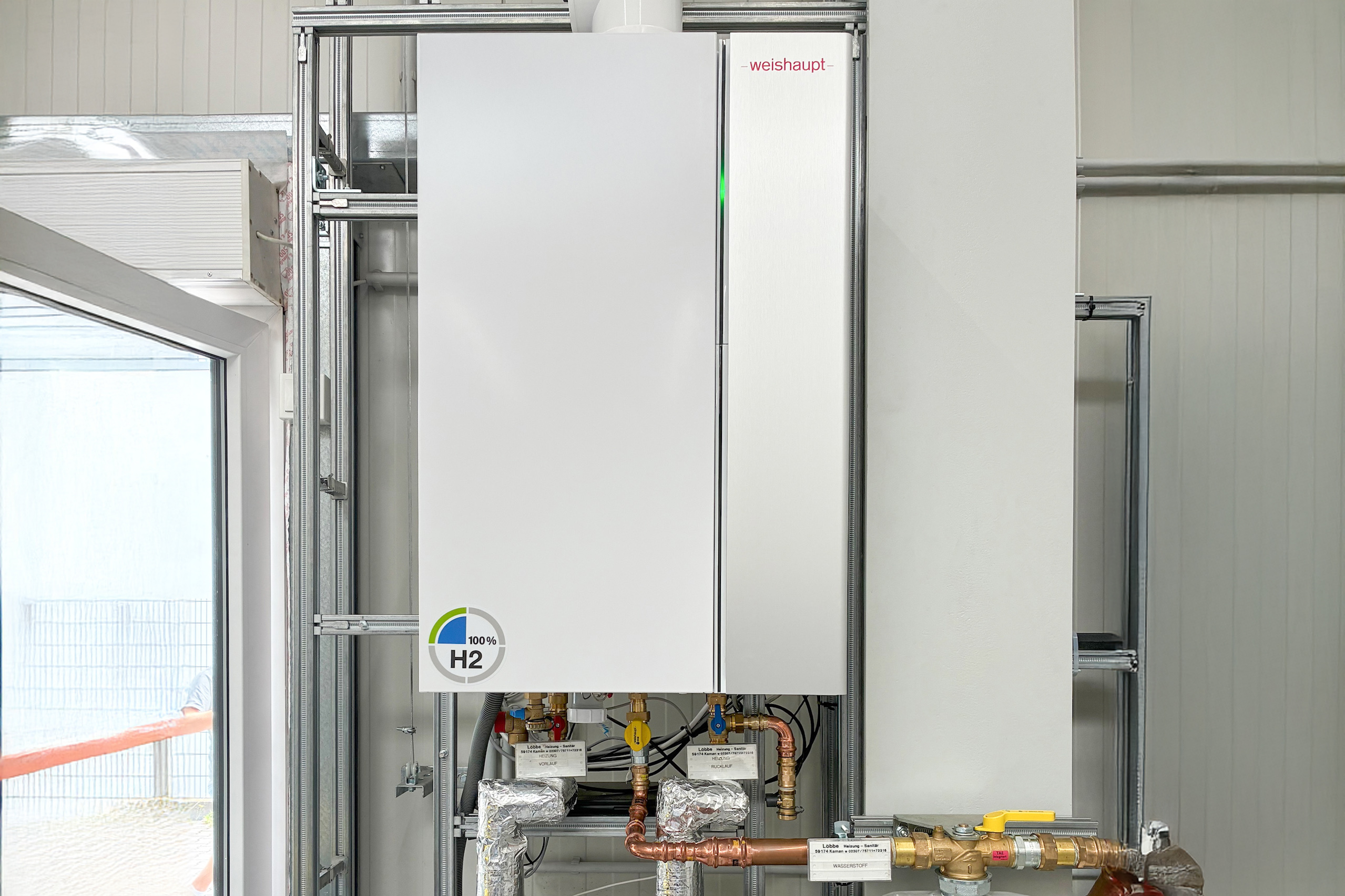Das mit 100 % grünem Wasserstoff betriebene Brennwertgerät Weishaupt Thermo Condens® im Showroom des Projektes H2HoWi.
